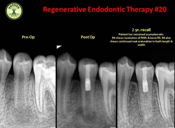Regenerative Endodontic Treatment uses tissue engineering to restore root canals in immature teeth to a healthy state. During this procedure, we will treat the necrotic portion of the tooth and promote continued root development, increased dentinal wall thickness, and apical closure.